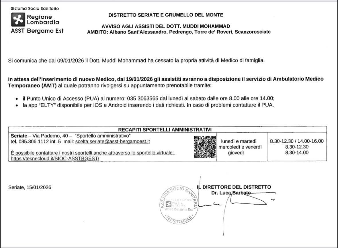 Dal 19.01.2026 gli assistiti del medico Muddi avranno a disposizione il servizio di Ambulatorio Medico Temporaneo (AMT)