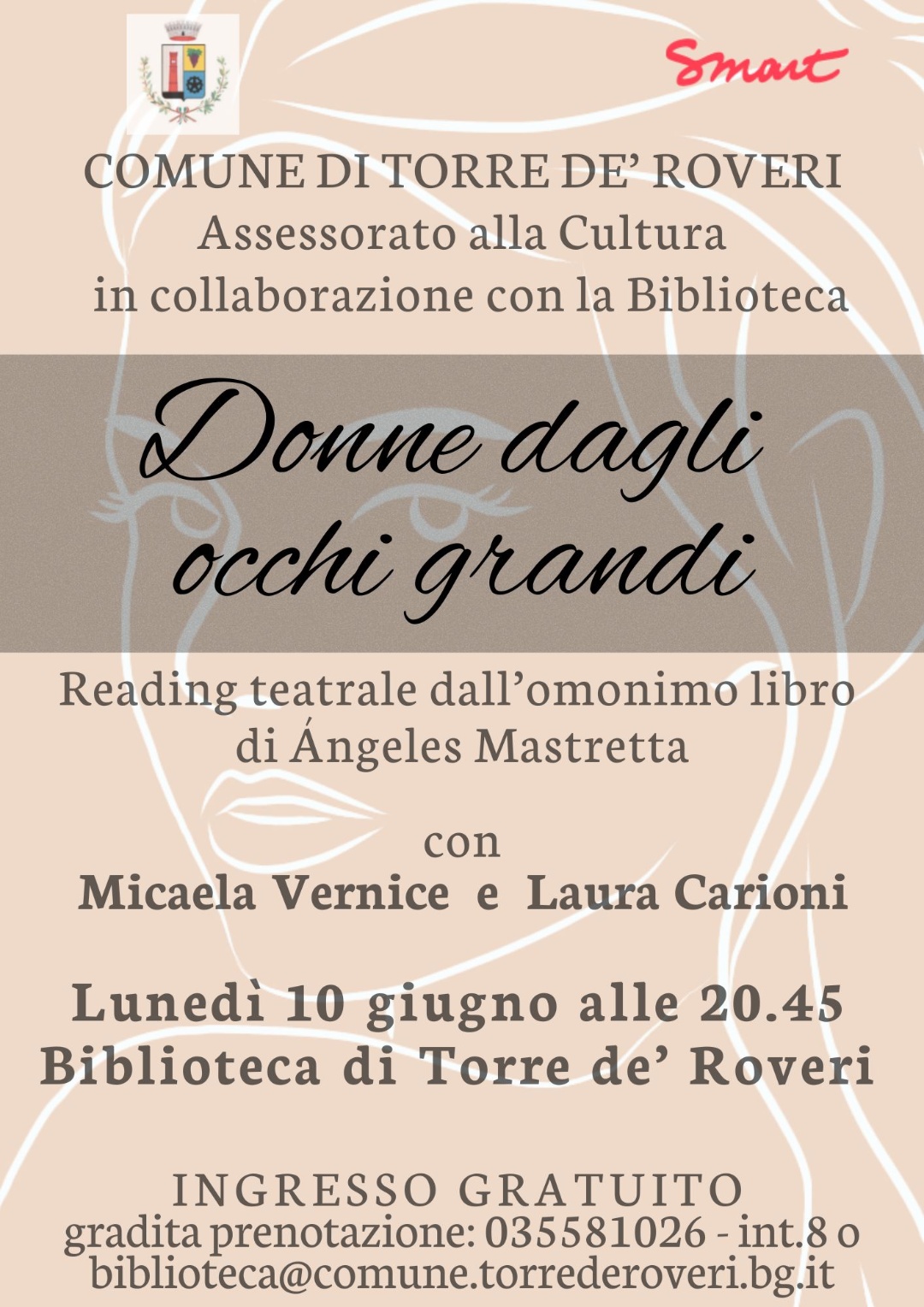 L'Assessorato alla Cultura, in collaborazione con la Biblioteca, propone il reading teatrale "Donne dagli occhi grandi", tratto dall'omonimo romanzo di Ángeles Mastretta, con la partecipazione di Micaela Vernice e Laura Carioni.